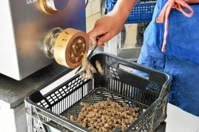 Une fois ce processus accompli, la pâte est mise en pression sur la filière qui définir la forme des pâtes.